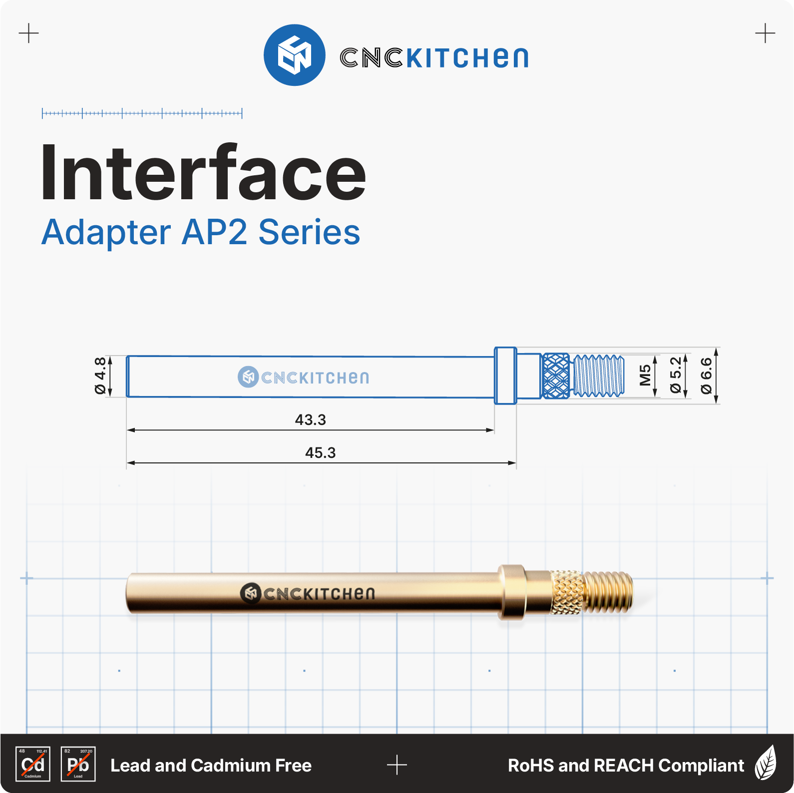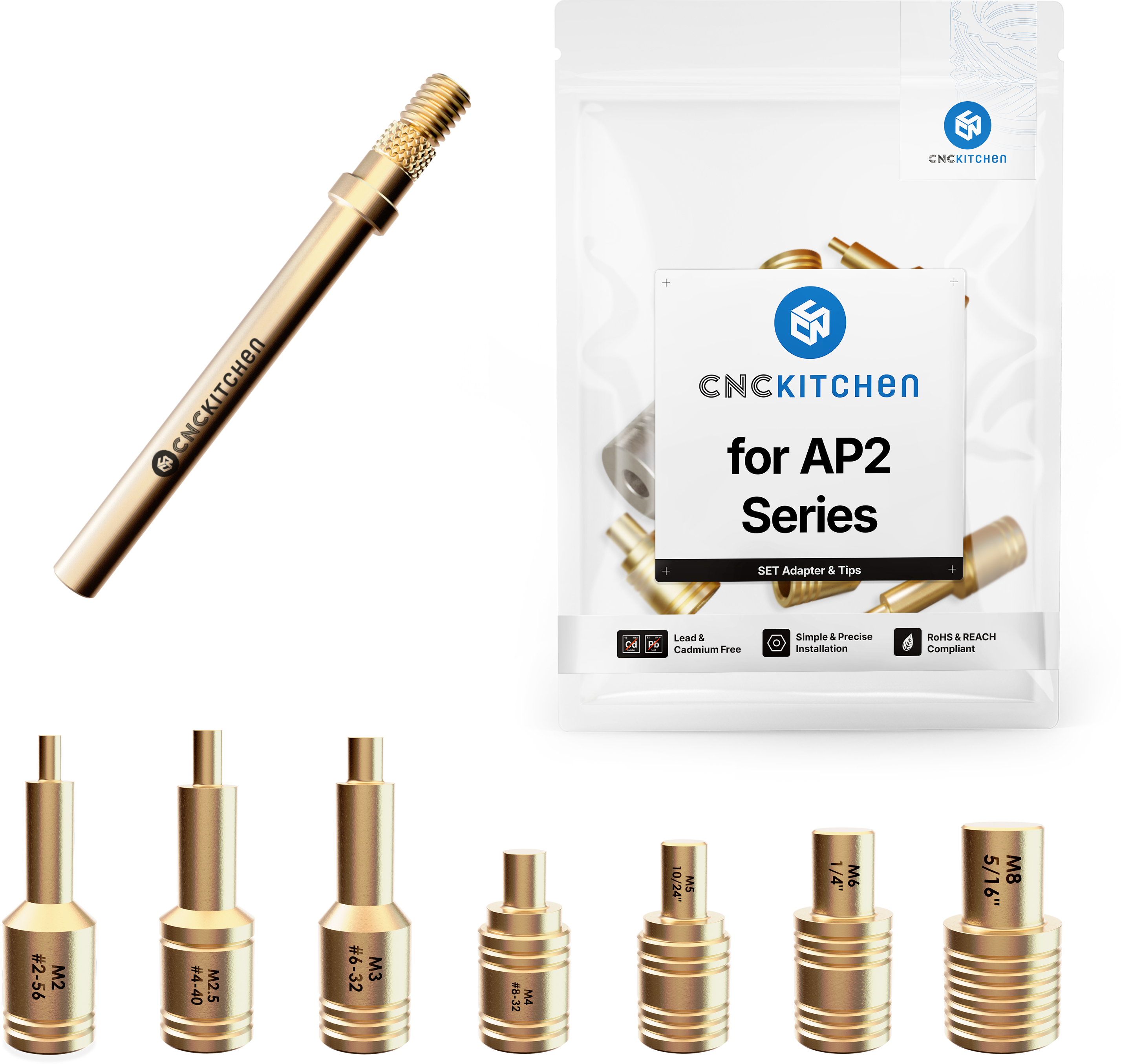 The soldering tips are compatible with AP2 standard soldering irons and are perfectly matched to CNC Kitchen threaded inserts. They feature laser markings and notches for easy size identification. REACH-compliant.