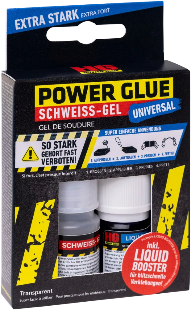 HG Power Glue Weld Gel including Booster is a high-performance adhesive system designed for fast and permanent repairs. The combination of high-viscosity gel and a curing accelerator ensures precise application and lightning-fast adhesion, making it suitable for demanding applications in everyday life, trade, or hobby sectors.