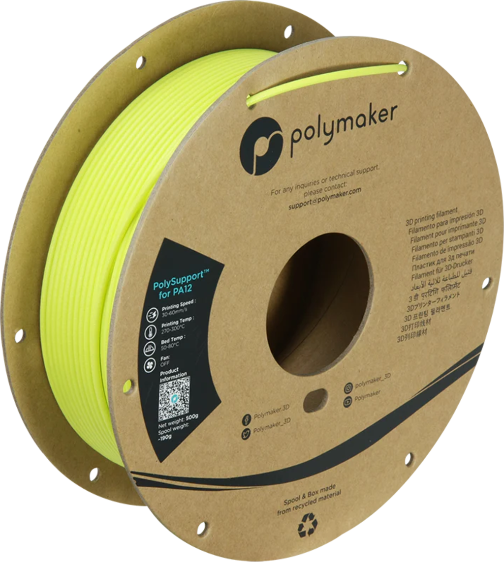 Polymaker PolySupport™ for PA12 has been specially developed as a breakaway support material for PA12-based filaments. It forms an excellent interface with long-chain nylons, providing the strength needed to support complex structures while still being easy to remove by hand after printing – with no tools or chemical treatment required.