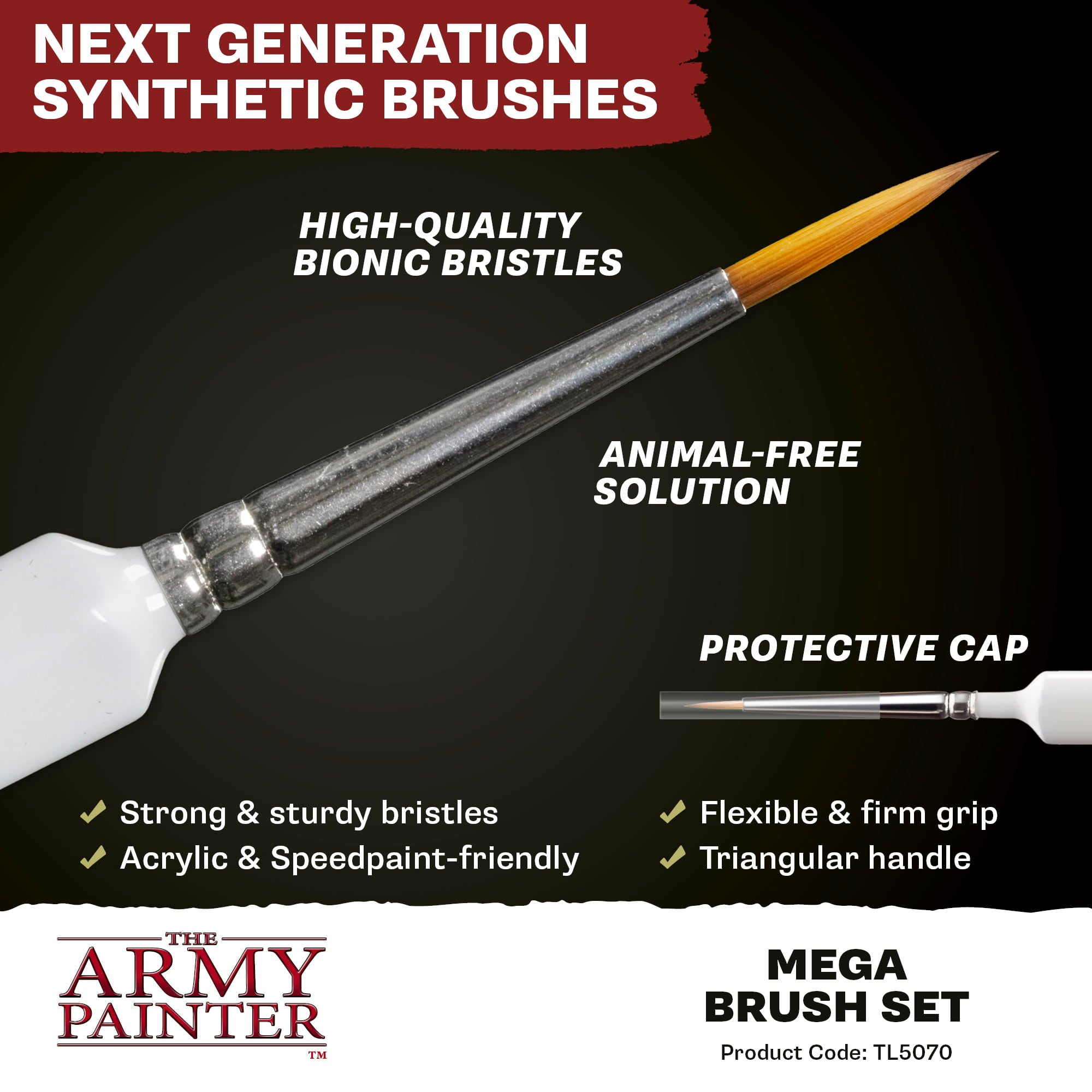The Army Painter Mega Brush Set gives you the complete Wargamer brush collection in one package! Featuring the innovative Bionic Bristle technology, these brushes combine precision, durability, and shape retention. Specially developed synthetic high-performance bristles are designed to meet the exacting requirements of tabletop and miniature painters, offering controlled paint pick-up and flawless application.